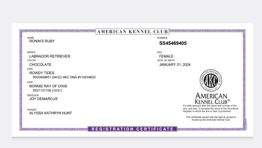 Ruby comes from an excellent hunting line pedigree with famous descendants such as Trieven Thunderhead(1995 Hall of fame), 96′ NFC AFC Storm’s Riptide Star, and NFC AFC Paha Sapa Chief II (1993) and many other victorious hunting dogs. She is lean and has a gorgeous dark chocolate coat. Ruby is titled in various sports and earned her first award at only 6 months of age.